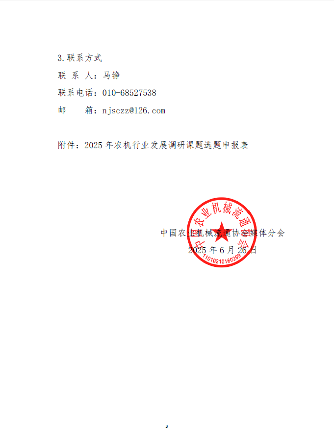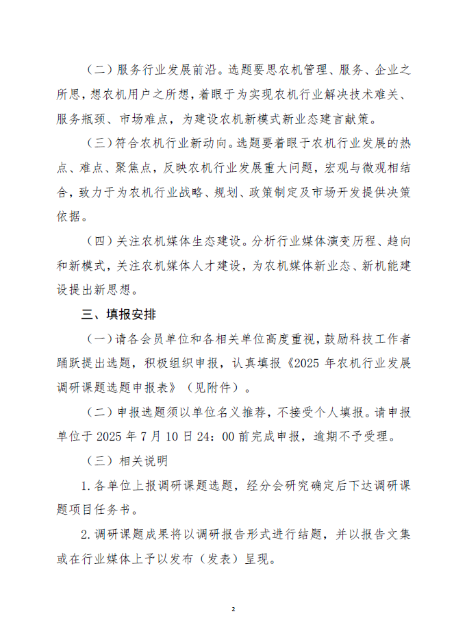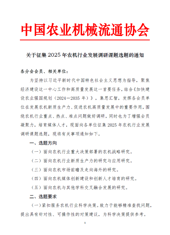 为散念汇智,发扬各会员单元正在成长农机新量消费力、增进农机下量量成长中的紧张感化,盘绕农机止业中心、热门、易面题目干美调研,共时也为了加强会员凝结力,培养媒介人材,华夏农业机器通畅协会现里背各单元搜集2025年农机止业成长调研问题选题。正式文献以下。